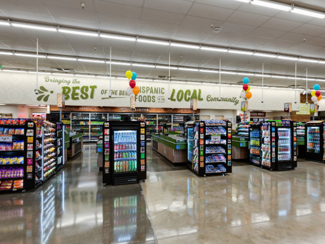 The project included upgraded kitchens, new display cases, shelving, and refreshed paint and décor throughout. The new market now offers a full-service carnicería, a panadería featuring traditional Mexican pastries baked fresh daily, an authentic cocina with tacos, burritos, and other prepared foods, a salsa and ceviche bar, aguas frescas, family meals like chile verde and fried chicken, and a coffee bar.
